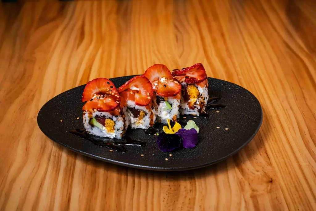 Atún, mango, aguacate y queso crema. Cubierto de salmón y fresas soasada.